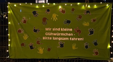 Zuvor erhielten die Kinder von uns einen reflektierenden Leuchtstern, den die Eltern an der Kleidung der Kinder befestigten. Mit viel Freude und Engagement haben wir im Vorfeld ein Banner mit Leuchtfarbe gestaltet, das im Dunkeln gut sichtbar ist. Darauf steht: "Wir sind kleine Glühwürmchen – bitte langsam fahren!"